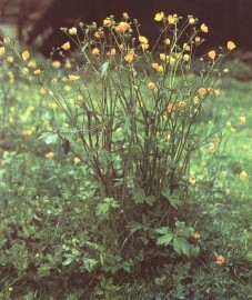 Ботаническое описание. Из очень короткого утолщенного корневища этого многолетнего растения развиваются прямостоячие стебли, достигающие в высоту 30-100 см. Они полые, ветвящиеся и слабоопушенные. На концах ветвей располагаются яркие золотисто-желтые цветки. Листья выглядят по-разному. Прикорневые листья 5-7-пальчатораздель-ные, на длинных черешках; их доли неправильно-выемчатые или пильчатые. Стеблевые листья имеют более простое строение, с линейными долями, сидячие. Цветет с мая по июнь. Встречается в большом изобилии на лугах, где совсем не радует крестьян, поскольку он опасно ядовит для пасущегося скота. Едкие вещества становятся недейственными, только когда растение высушено. Поэтому сено для скота безопасно. Разные виды желтых лютиков, имеющие сходный облик, в народной медицине не различаются; например, лютик луковичный (Ranunculus bulbosus L.) используется в гомеопатии. Он обитает на солнечных сухих лугах, пашнях и паровых полях и отличается от других видов более вытянутой формой цветоложа, жестким стеблем, более крупными цветками и похожим на луковицу основанием стебля.
