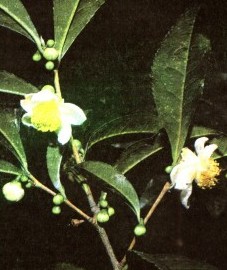 Ботаническое описание. Исходную родину чайного куста установить трудно. Как культурное растение он издревле возделывается в Китае, с XVIII века - в Индии и Шри-Ланке, а с XIX века - на обширных площадях в самых разных местах земного шара. Чайный куст может достигать в высоту 15м, однако культурные насаждения поддерживают на меньшей высоте, чтобы легко было собирать листья. За счет подрезки растения чая обильно ветвятся. Листья глянцевые, темно-зеленые, удлиненно-яйцевидные; края их отчетливо пильчатые. Цветки одиночные, с 5-6 беловатыми лепестками и многочисленными желтыми пыльниками, имеют сильный запах и достигают 3 см в диаметре.