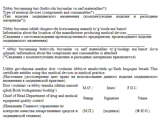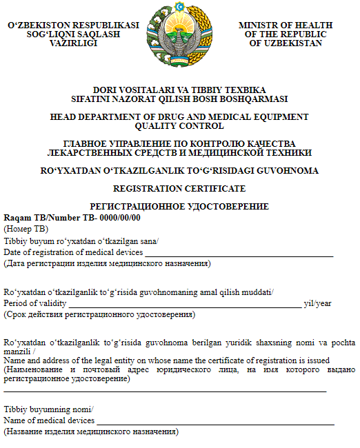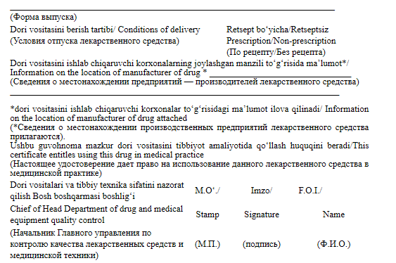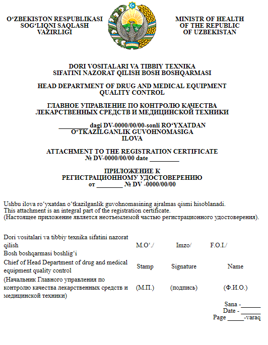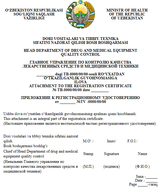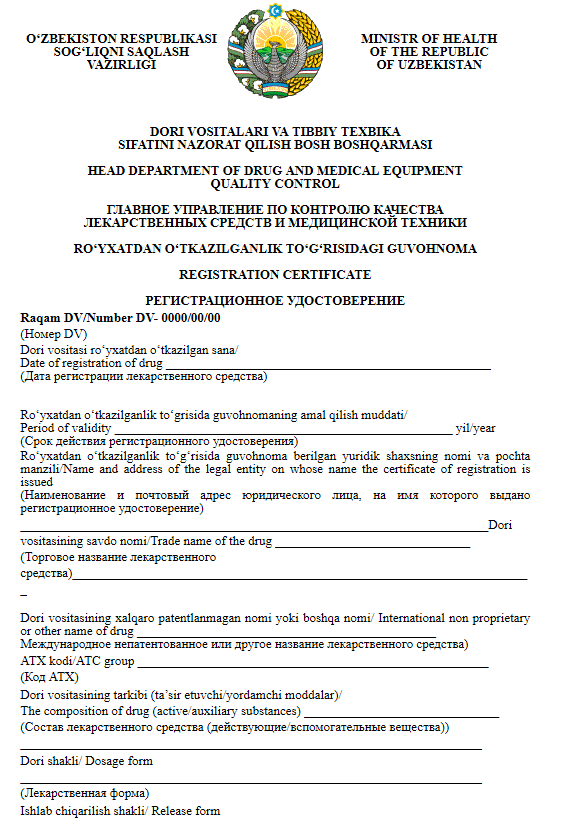 - Настоящее Положение разработано в соответствии с законами Республики Узбекистан «О лекарственных средствах и фармацевтической деятельности» и «О разрешительных процедурах в сфере предпринимательской деятельности» и определяет порядок регистрации и выдачи регистрационного удостоверения лекарственного средства и изделия медицинского назначения.