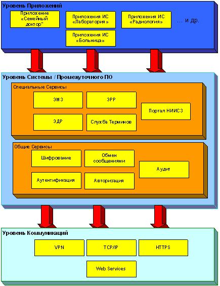 Между Уровнем Коммуникаций и Уровнем Приложений (внешние приложения и системы по медицинскому обслуживанию) расположен Уровень Системы/ Промежуточного ПО с целью оптимальной обработки процессов взаимодействия. Этот компонент предоставляет общие сервисы для приложений (с Уровня Приложений). Непосредственно перед Уровнем Коммуникаций расположен Уровень общих сервисов Промежуточного ПО. Он состоит из компонентов, обеспечивающих аутентификацию, авторизацию, регистрацию транзакций, шифрование и т.д. В общем, этот компонент предоставляет общие сервисы, которые приложения (с Уровня Приложений) могут легко использовать в обработке. Перед этим уровнем расположен еще один набор специальных сервисов, более ориентированный на медицинские задачи, но по-прежнему предоставляющий общие сервисы для приложений (с Уровня Приложений). Он содержит сервисы по управлению информацией и данными, по работе портала и т.д. Также этот уровень обеспечивает сбор, обработку и хранение данных в соответствии с высокоэффективным контролем качества информации.