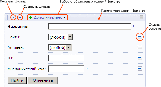 Кнопка Показать фильтр отображает фильтр и все критерии поиска. Нажатие кнопки Свернуть фильтр скрывает его, оставляя видимой лишь панель управления фильтра. Нажав кнопку Дополнительно, можно выбрать, какие поля фильтра следует показать, а какие - скрыть.