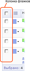 Колонка флажков позволяет выбрать один или более элементов для выполнения над ними каких-либо действий. Установка флажка в заголовке таблицы приводит к выбору всех элементов таблицы.