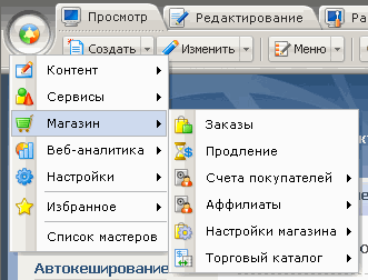 С помощью этой панели можно выбрать обособленный набор функций, относящийся к определенной функциональной части системы. В зависимости от того, установлены ли те или иные модули, состав административного меню может различаться.