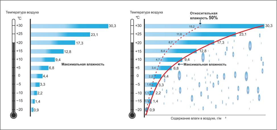Рис. 1 – Максимально возможное содержание влаги в 1 м3 воздуха. Чтобы судить о степени влажности воздуха, важно знать, насколько близок содержащийся в нем водяной пар к точке своего насыщения (к достижению значения максимальной влажности). Для этого используется величина относительной влажности воздуха – это отношение абсолютной влажности воздуха или фактической плотности водяного пара (p) к максимальной влажности воздуха или плотности насыщенного водяного пара (pо) при той же температуре, выраженное в процентах. формула Ключевое значение имеет тот факт, что максимально возможное количество влаги в воздухе (от которого в % считается относительная влажность) зависит от температуры окружающей среды. Получается, если нагреть воздух, тогда при той же абсолютной влажности, его относительная влажность снизится (теперь % берется от большего значения). И наоборот, если охладить воздух, его относительная влажность вырастет и та часть водяных паров, которая превысит содержание максимальной влажности воздуха для этой температуры начнет конденсироваться – появляется туман, выпадает роса, запотевают окна. Поэтому, температуру, при которой водяной пар становится насыщенным (выпадает роса), называют еще «точкой росы». Упругость (парциальное давление) водяных паров в воздухе, показывает, какая часть общего давления данного объема столба воздуха приходится на давление содержащихся в нем водяных паров. Упругость водяных паров зависит от содержания водяного пара в единице объема воздуха и температуры воздуха. Как не сложно заметить – упругость водяных паров в воздухе это такой же показатель, как и абсолютная влажность, правда выраженный не через массо-объемные отношения (г/м3), а через единицы давления (мбар или мм.рт.ст.). В качестве основной величины нормирования нам важно значение относительной влажности. Она примерно дает соотношение влажности и точки росы, а значит определяет когда еще суха, а когда уже влажно. К тому же ее проще измерить. Пределы по влажности Лекарственные средства, как правило, требуют хранения в сухом месте. В отличие от потребителя, нам профессионалам, очень нужно единое понимание диапазона допустимых значений относительной влажности. Только в большинстве случаев, в этом вопросе злую шутку играет профессиональный снобизм и, как это не покажется странным, потребность все унифицировать. Рассмотрим простую ситуацию.