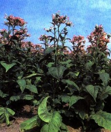 Ботаническое описание. Стебель этого растения достигает 2-м высоты, железисто-опушенный, слаборазветвленный, с большими листьями и собранными в метелку воронковидными, карминно-красны-ми цветками. Родина табака - Виргиния, но культивируют его во многих странах, особенно на Кубе и в Бразилии, а также в Европе.