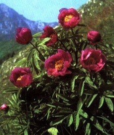 Ботаническое описание. Многолетнее растение с грубыми стеблями и раздельными сложными листьями. Разводят в садах ради крупных махровых винно-красных (реже беловатых) цветков. Родом из Южной Европы; выращивают обычно в цветниках.