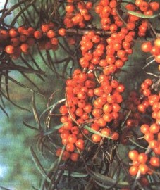 Ботаническое описание. Это невысокий или средних размеров кустарник, который может также расти в форме дерева, достигая иногда более 5 м в высоту. Его корни проникают глубоко в почву, от главного корня отходят ползучие боковые, развивая большое число корневых отпрысков. Ветви растопыренные и колючие. Листья облепихи напоминают ивовые: у них линейная форма и серебристо-белое опуше-ние с нижней стороны. Цветки невзрачные, после опыления развиваются оранжево-красные блестящие плоды. Они яйцевидные, размером редко более 1 см, с орешковидным семечком; на вкус очень кислые, с ароматическим запахом. Обычные естественные местообитания облепихи - песчаные дюны у моря, берега рек и ручьев, склоны. В последнее время ее все больше выращивают в садах и парках. Благодаря своей корневой системе облепиха является хорошим закрепителем песков и оползней, ее часто сажают на склонах вдоль улиц и шоссейных дорог. Цветет в апреле; плоды созревают в сентябре-октябре.Сбор и заготовка. Из-за растопыренных ветвей и острых колючек сбор зрелых плодов - очень трудоемкое дело. Испытанным считается следующий метод: большие ветки обвязывают шнуром, пригибают в радиусе куста, на землю под них кладут ткань и ножницами срезают на нее зрелые плоды. Отрывать плоды пальцами не рекомендуется: их легко раздавить, при этом теряется ценный сок. Затем плоды перерабатывают на сок, пюре или варенье.