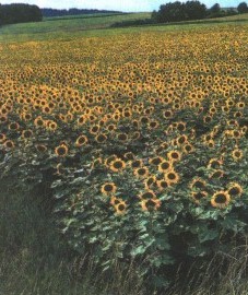 Ботаническое описание. Подсолнечник - одно из самых крупных растений среди сложноцветных и, пожалуй, самое любимое. Нет таких огородов в сельской местности, где бы среди прочих растений не красовался этот гигант. Несмотря на свою величину, это - однолетнее растение. От мочковатого корня отходит стебель, который может достигать в высоту 3 м. Листья сердцевидно-треугольные, заостренные, грубоопушенные, черешковые, расположены на стебле поочередно. Мощный стебель с полой сердцевиной венчает гигантское соцветие-корзинка диаметром от 10 до 35 см. Снизу соцветие окружено оберткой из зеленых черепицеобразно расположенных листочков. Цветки центральной части корзинки мелкие, а ярко-желтые язычковые значительно длиннее. К началу цветения корзинки поникают. Цветет с июля до сентября. Подсолнечник выращивают в садах и на полях. Культивирумых сортов много, они отличаются друг от друга размерами корзинок и содержанием масла в семенах. Отдельные эк-, земпляры иногда "убегают" на свободу, и тогда на железнодорожных насыпях, компостных кучах и по пустырям появляются одичавшие подсолнухи. Но их собирать не следует. В лечебных целях используют цветки только культурных растений. Масло из семян нельзя отжать самостоятельно, его получают на заводах.