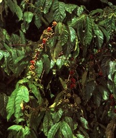 Ботаническое описание. Небольшое вечнозеленое деревце до 6 м в высоту, в культуре ниже. Листья с черешками, кожистые, удлиненные, до 20 см в длину. Снежно-белые пахучие цветки располагаются ложными мутовками в пазухах листьев. Плоды (кофейные ягоды) сначала зеленые, потом красные, и наконец, фиолетовые. Родиной кофе можно считать Эфиопию. Сейчас культивируется во многих тропических областях.